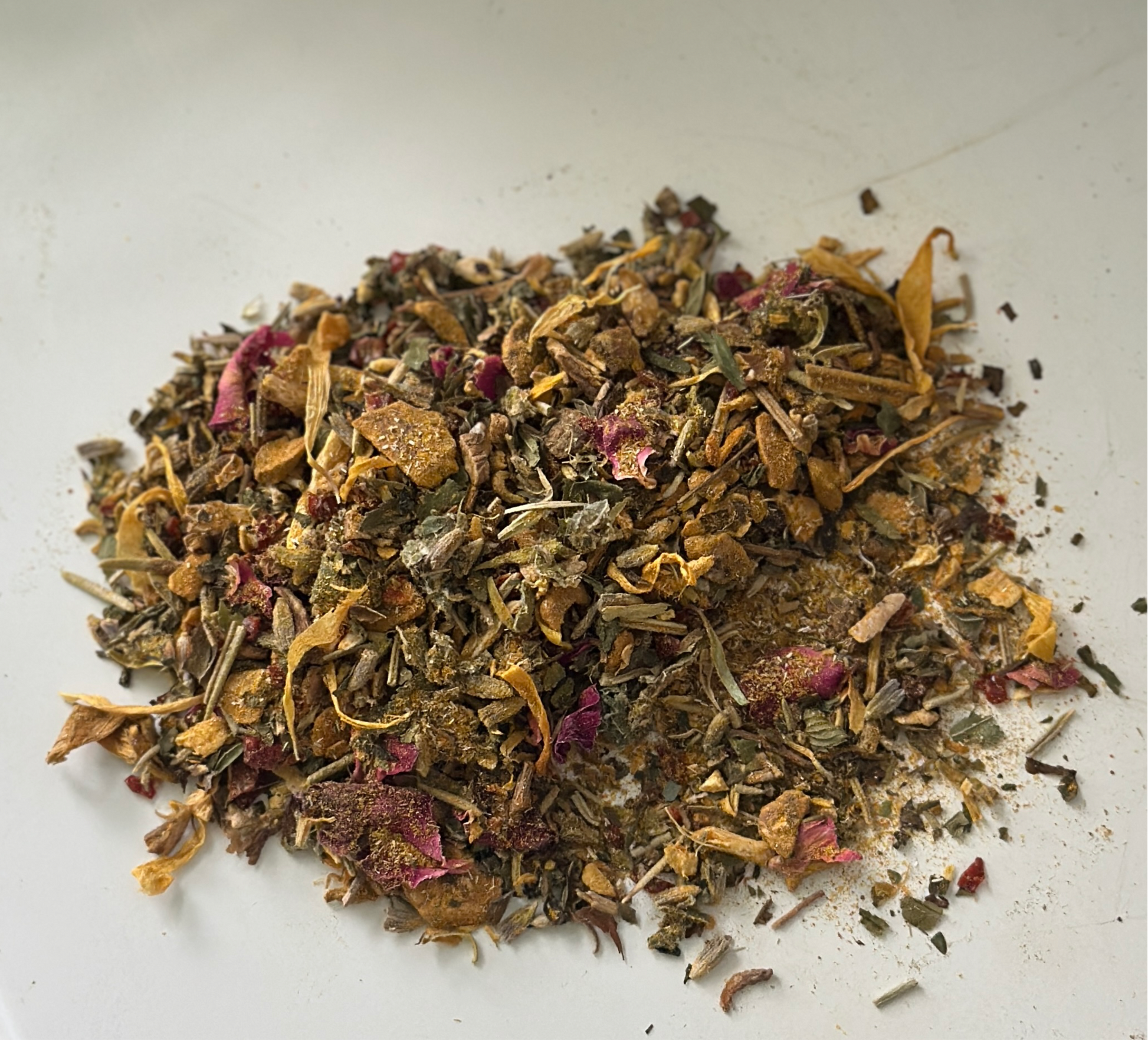INGREDIENTS~ Rosehip, Chamomile, Red Clover, Calendula, Stinging Nettle, Cramp bark, Lavender, Raspberry Leaf, Dong quai, Uva ursi, Peppermint, Rosemary, Tumeric, and Ginger root.